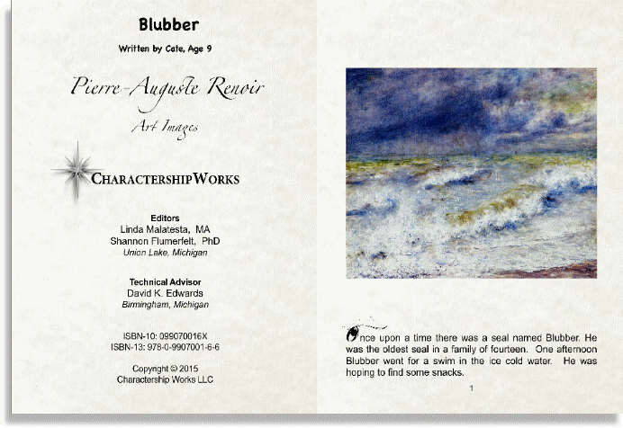 Blubber is a wonderful storybook written by a child and features art images by master artist, Pierre-Auguste Renoir (1841-1919). Blubber deals with survival in the deep ocean. As the story unfolds, Blubber decides that he must better himself through training and education. His journey has ups and downs, but in the end, Blubber prevails. The beauty of this story engages the reader to consider critical lessons of creativity, leadership and character development. |