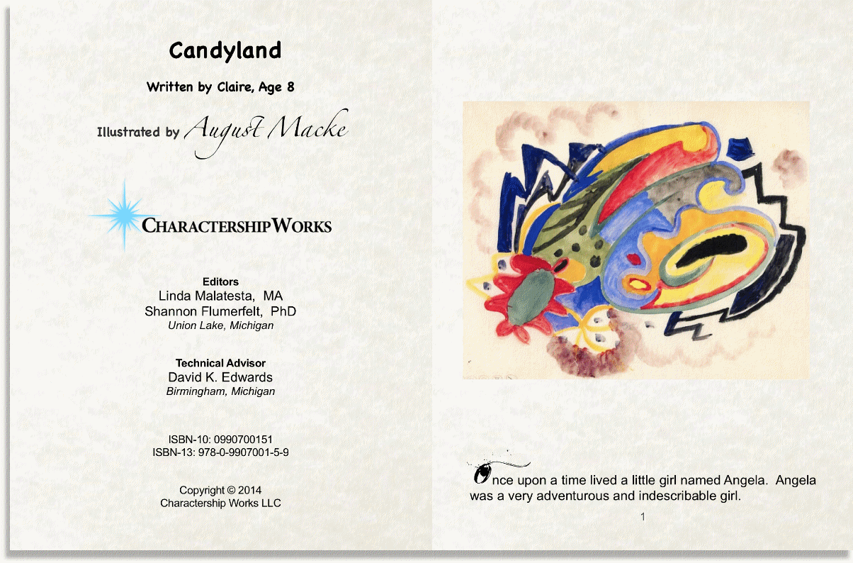 Candyland is a delightful storybook written by a child and illustrated by master artist, August Macke (1887-1914). Angela romps through Candyland and uses her imagination to create yummy combinations of treats for desserts. She becomes mindful of her consumption and monitors her wellness as she continues through Candyland. The ending to Angela’s journey is a sweet surprise. The beauty of this story engages the reader to consider critical lessons of creativity, leadership and character development. |