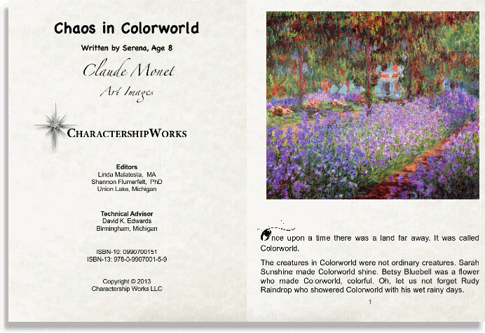 Chaos in Colorworld is an imaginative storybook written by a child and illustrated by master artist, Claude Monet (1840-1926). The smooth dynamics in Colorworld are interrupted when a community member, Rudy Raindrop, uses his abilities for the wrong reasons. As the members of Colorworld struggle to find a solution, Rudy Raindrop reconciles how to best use his talents for the good of all. The beauty of this story will engage the reader to consider critical lessons of creativity, leadership and character development. |