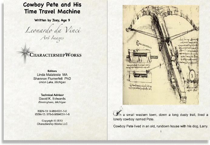 Cowboy Pete and His Time Travel Machine is a humorous storybook written by a child and illustrated by master artist, Leonardo daVinci (1452-1519). The story begins with Cowboy Pete caught up in his daydreams about inventing things. As a result, he encounters an embarrassing situation. Cowboy Pete decides to apply himself and discovers a way to help others. The beauty of this story will engage the reader to consider critical lessons of creativity, leadership and character development. |