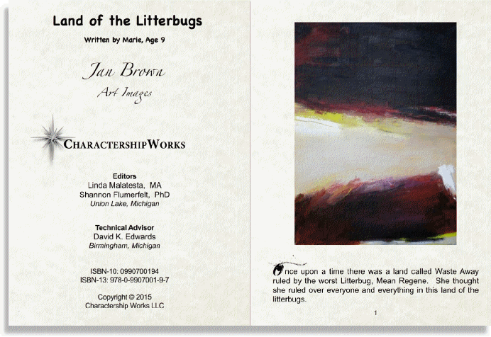 Land of the Litterbugs is a green storybook written by a child and features art images by Jan Brown. Mean Regene, a ruthless litterbug leader, uses fear to keep her domain messy. That is until Batina, a recycling bug, comes to the rescue. There is tension between the litterbug and recycling bug, until Mean Regene gains an improved understanding of leadership. The beauty of this story engages the reader to consider critical lessons of creativity, leadership and character development. |