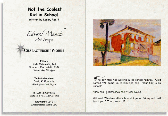 Not the Coolest Kid in School is a triumphant storybook written by a child and illustrated by master artist, Edvard Munch (1863-1944). Max struggles with school bullying and his emerging self-identity. A process of trial and error leads to a healthy choice and self-acceptance. The beauty of this story engages the reader to consider critical lessons of creativity, leadership and character development. |