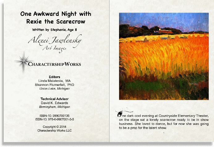 One Awkward Night with Rexie the Scarecrow is an imaginative storybook written by a child and illustrated by master artist, Alexey von Jawlensky (1864-1941). Rexie is a stage-struck scarecrow prop for an elementary school talent show. Instead of being just a stage prop, Rexie wants to dance. A chance encounter with a student leads to a shared belief in possibilities and a long night of joyful dancing. The beauty of this story engages the reader to consider critical lessons of creativity, leadership and character development. |