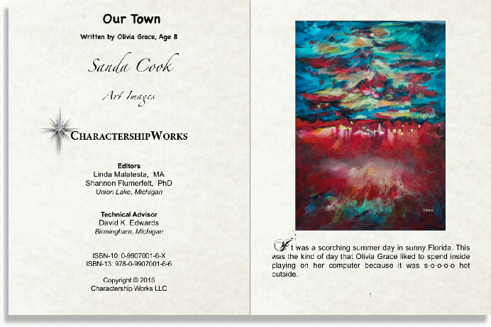 Our Town is a powerful recycling storybook written by a child and features art images by Sanda Cook (b.1972.) Olivia Grace, a young leader in the community, works to engage others in a significant movement to improve the environment. This story demonstrates that forming a big idea, speaking up and taking collaborative action are paths to positive change. |
