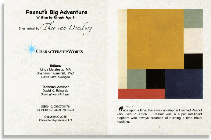 Peanut's Big Adventure is an adventurous storybook written by a child and illustrated by Theo von Doesburg (1883-1931). Peanut, an elephant has a dream to build a time travel machine. With a team of friends, they travel one hundred years into the future and are stunned by their discovery. Determined to change a daunting future, Peanut and his friends engage others to begin taking better care of the earth. The beauty of this story engages the reader to consider critical lessons of creativity, leadership and character development. |
